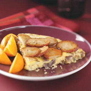 In a large bowl, whisk the eggs, milk, salt and pepper. Stir in cheese and onion mixture. Melt remaining butter in the skillet; tilt pan to evenly coat. Add egg mixture. Bake at 350° for 8-10 minutes or until nearly set.