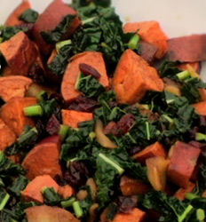 When sweet potatoes are tender (easily cut with the side of a fork), remove from oven and allow it to cool briefly. Put in a large serving bowl and add the apple, cranberry, kale mixture. Toss together gently. Drizzle 1 teaspoon of vinegar on top and fold in. Taste the composition. Add more vinegar or salt if needed. Serve warm or at room temperature. Will keep nicely in the refrigerator for several days.