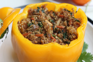 Combine the remaining ingredients with the quinoa. Divide the mixture among the peppers. Place the peppers upright in the baking dish and bake 15 to 20 minutes.