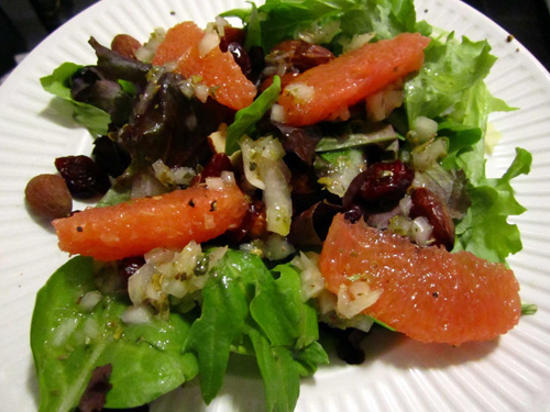 Peel and segment the orange over a small bowl to capture any juice. Add vinegar to the orange juice in the bowl, toss in the shallot and oregano. Slowly drizzle in olive oil, whisking constantly, until emulsified. Mound two plates with greens. Sprinkle the almonds and cranberries on top, lay orange segments on top. Drizzle with dressing, sprinkle with salt. Enjoy.